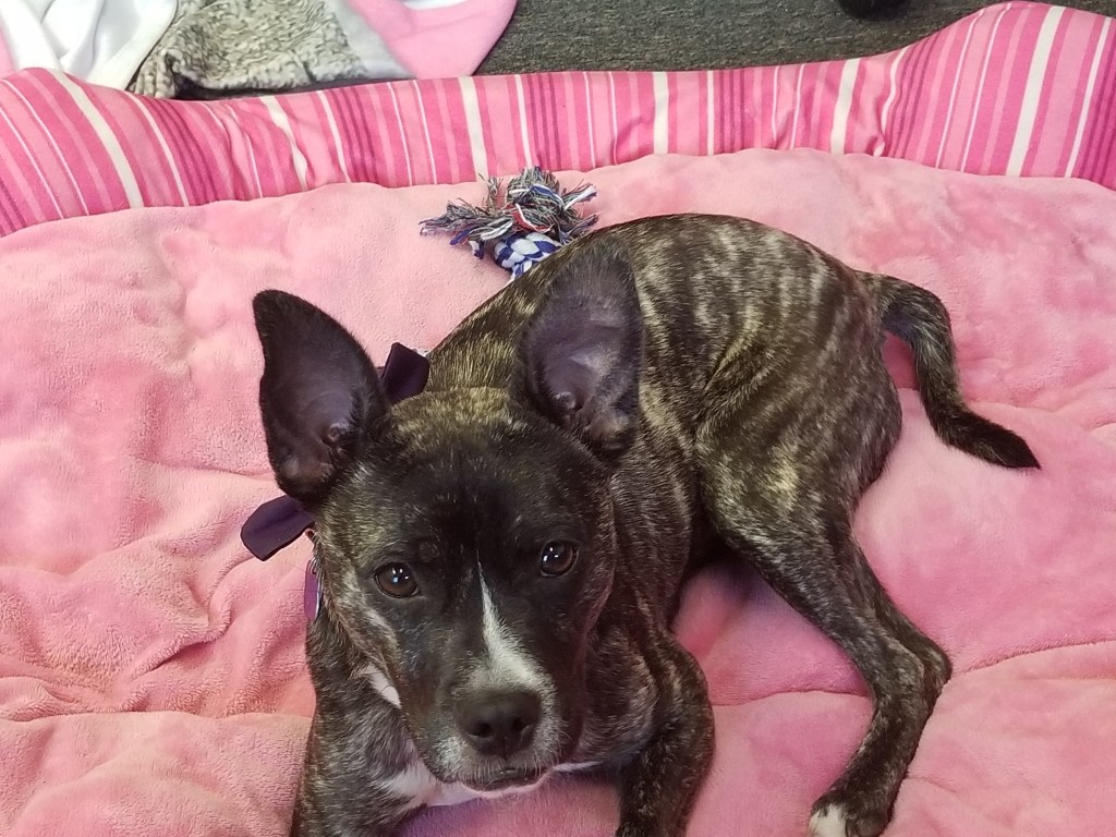 And then today we are short-staffed and working very hard and not paying attention to doggie, so he dragged his big pretty pink bed out to the center of the office and destroyed it while we weren’t looking.