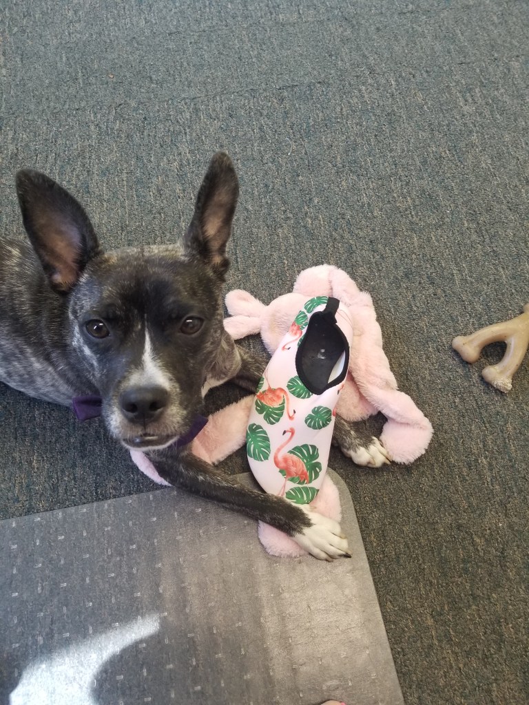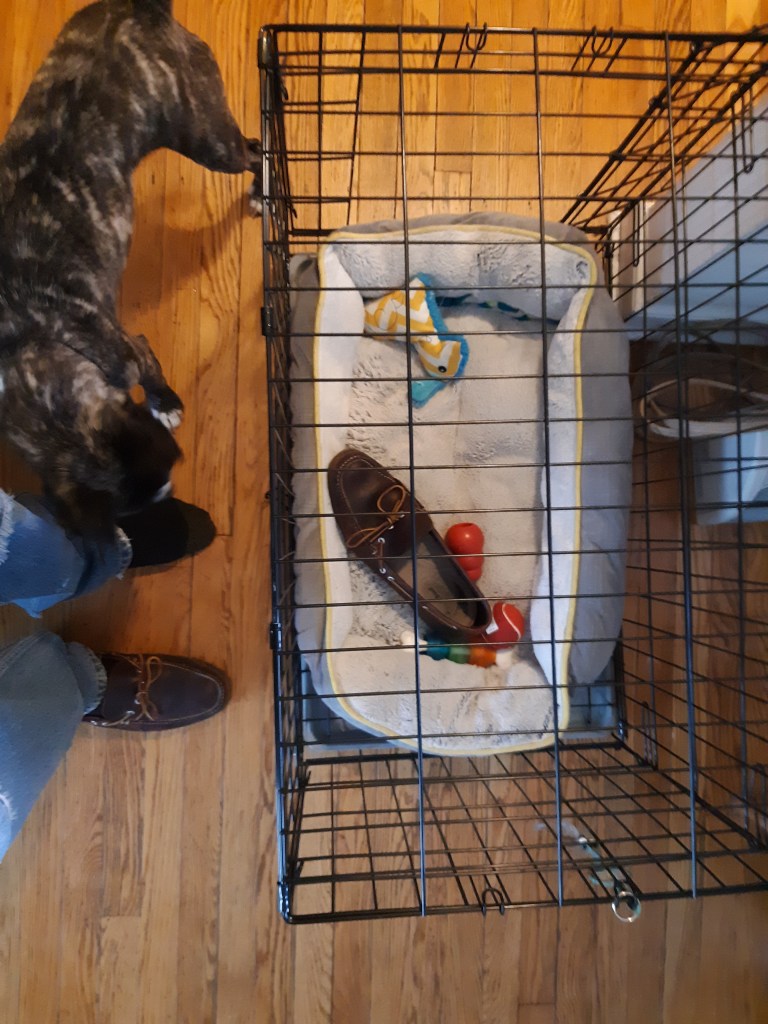 He doesn’t chew on them, just likes to collect them and them forget about them. Which can cause issues when you are walking around the house going “what the heck happened to my other shoe?” Which was the situation my father found himself in while dogsitting. I love how Albie looks as puzzled by the problem of “how did that shoe get there?” as the humans.