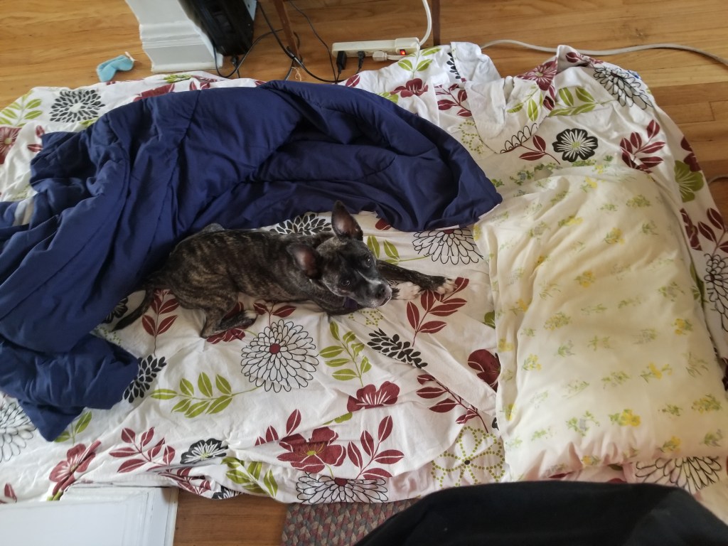 First, I have a new bed. I bought this thin bedroll thing which is amazing and super comfortable, especially on days when the nights are too cool for air conditioning but too hot for me to want to lock myself in my bedroom, now I can sleep on the living room floor. I thought it was my bed, but apparently it is now Albie Dog’s bed.