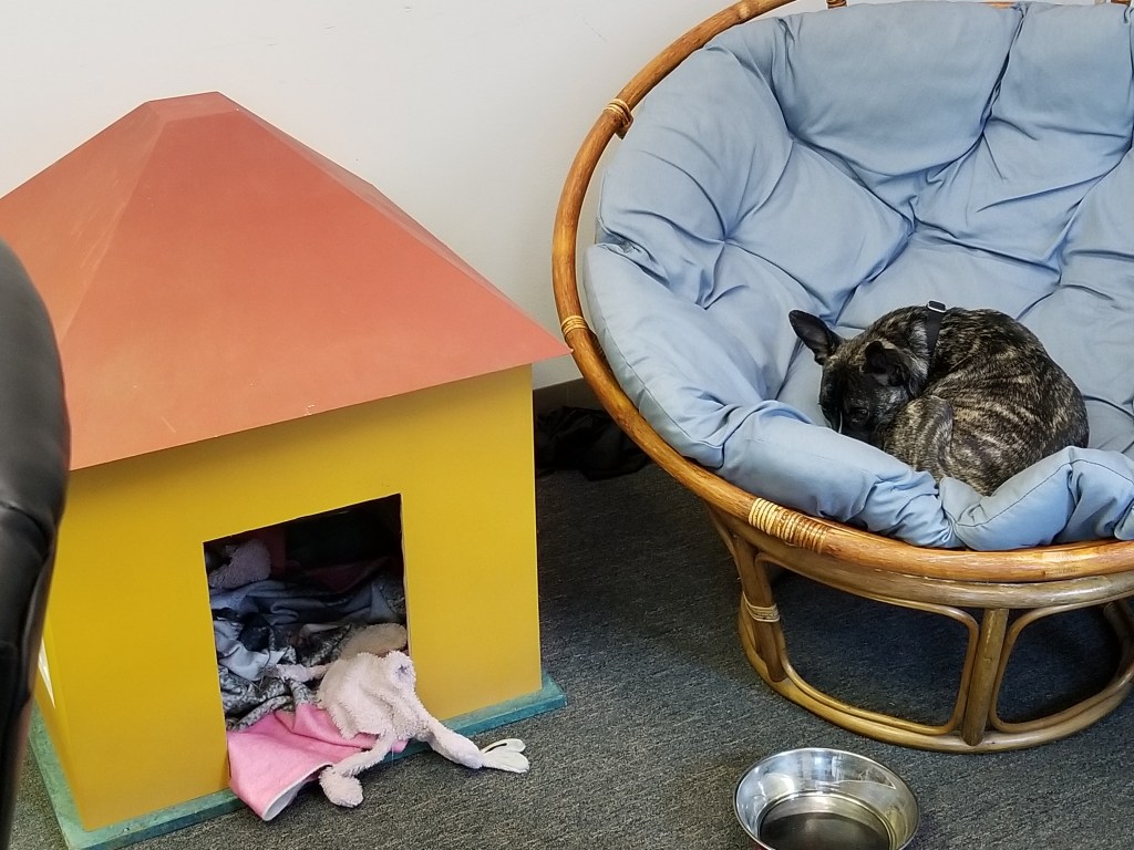 Oh, and one more Albie Dog story! One of my co-worker’s boyfriend works in the scenery department of a theater. They made a bunch of tiny wooden houses for the background in some show and she grabbed one of the leftovers for Albie Dog. It’s so cute! And Albie Dog is so unsure of it!