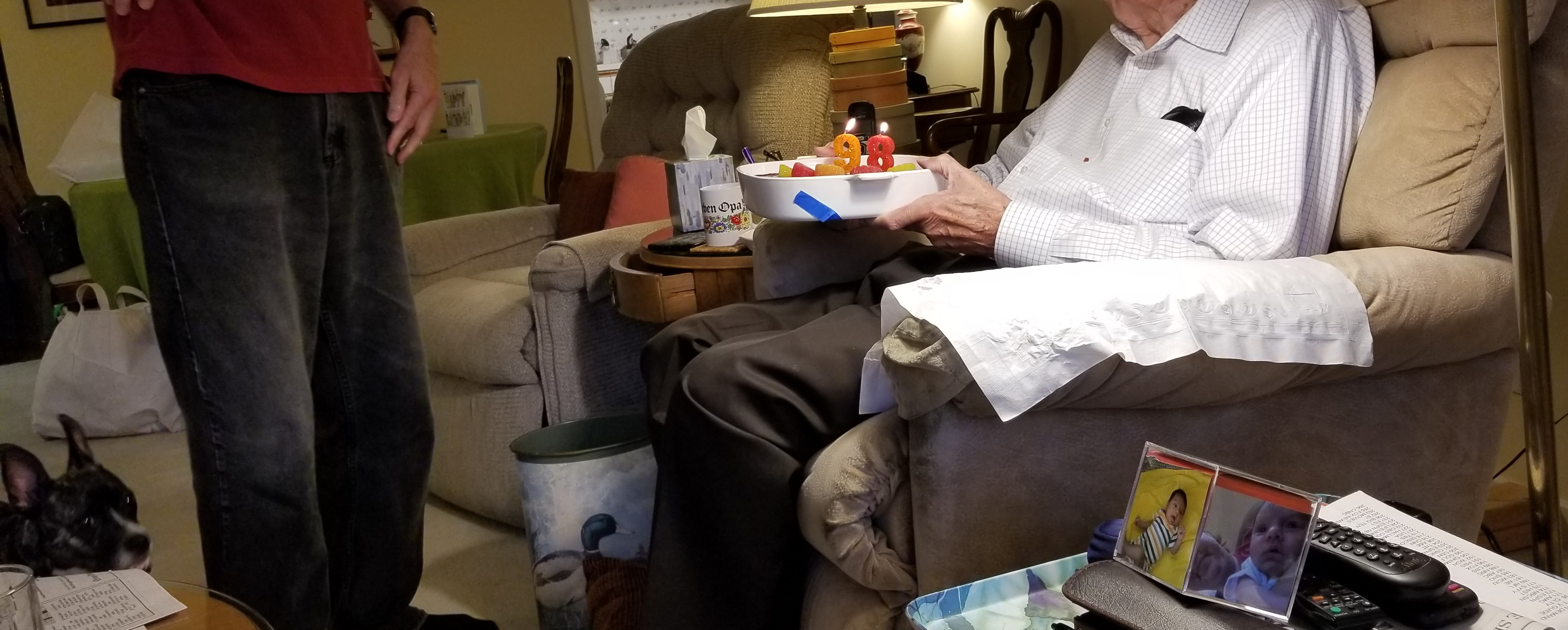 Meanwhile, Grandpa’s birthday went off well. Albie Dog partied with him, and I gave him a cube of family photos (new baby great-grandson plus photos of each of his 3 granddaughters).