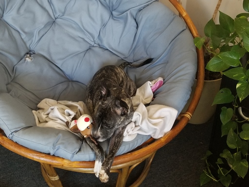 Albie Dog finds this whole thing stressful and exhausting. The baby cries, he cries, my sister comforts the baby, I comfort Albie Dog, and then finally we go home and he can relax. Yesterday at work he just curled up and hugged his raindeer toy (from Santa!) all day.