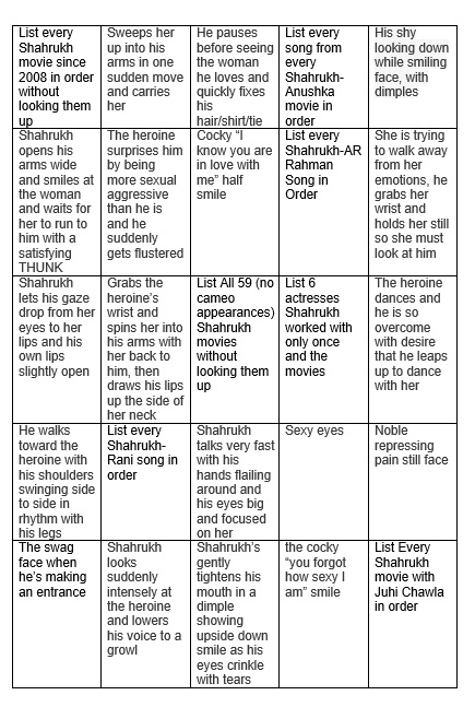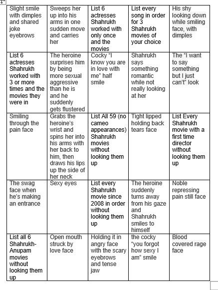 I know some SRK trivia, but I would be dead last in answering your SRK question cards, unless I were competing against a tree. That is definitely a #truefan list!
