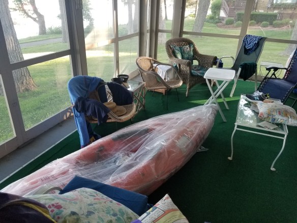Beautiful Kayak. Hard to believe you were able to hide it from your mom. Also sweet that it can stay at the house and you don’t have to lug it around. We got a pair of kayaks for our wedding (13 years ago), which we still have, but they don’t get more than a couple uses a year as they are such a pain to load on and off our car. But we have little ones for the kids that we use all the time, including today!