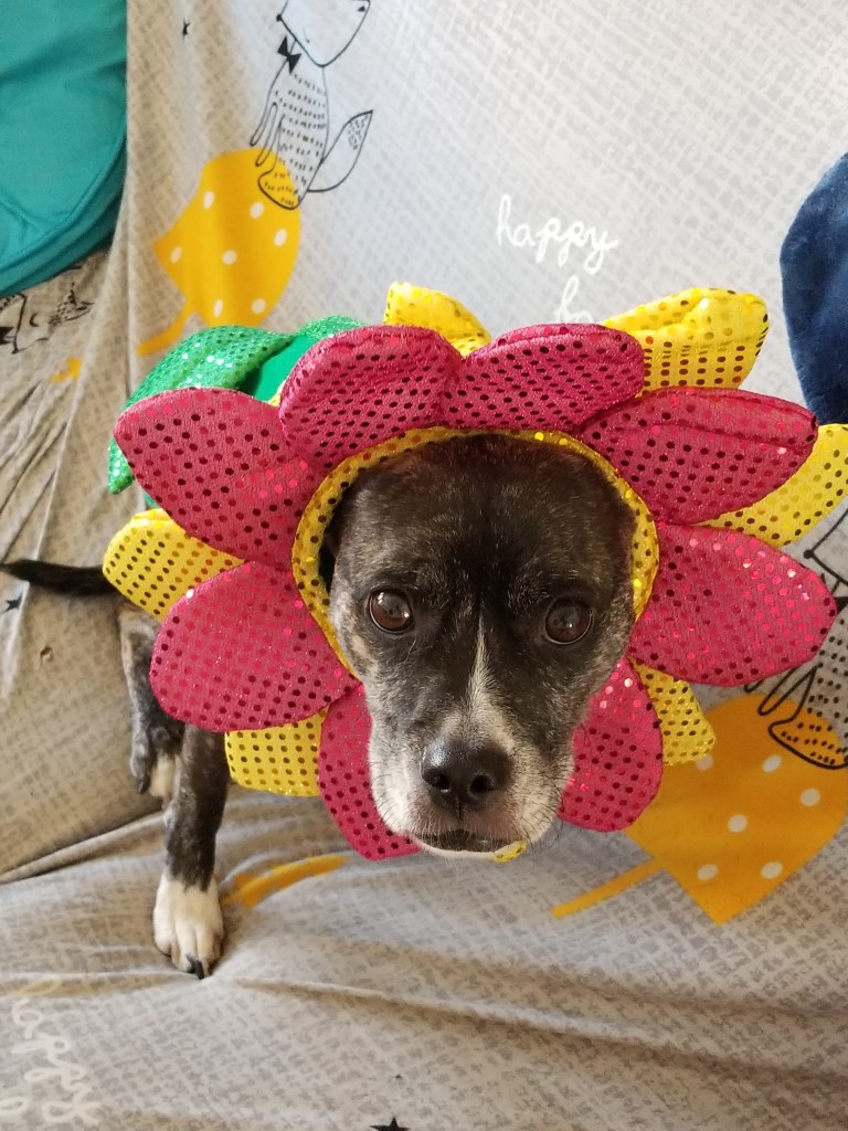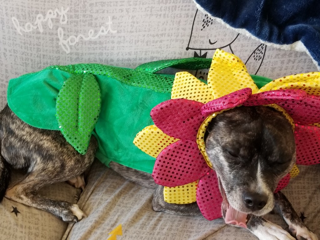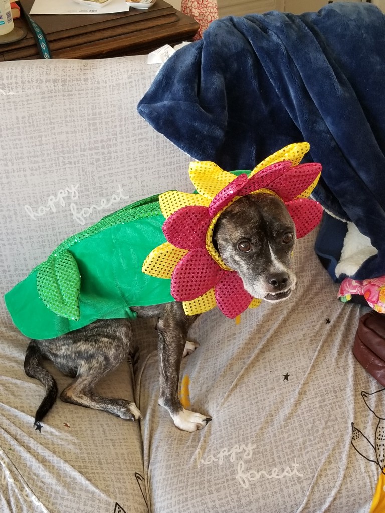 That is too cute! If I tried putting that costume on my dog, the flower would turn into a snapdragon. Albie, you are a patient, good boy.
