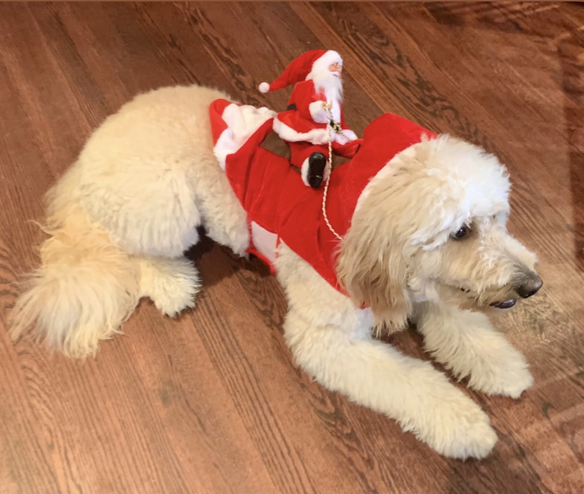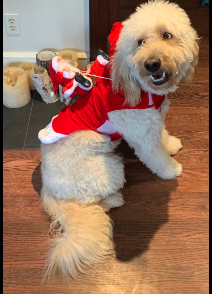 Yes Theodore!!!! No idea what is happening and about to buck little toy santa off his back. But so cute!!!!