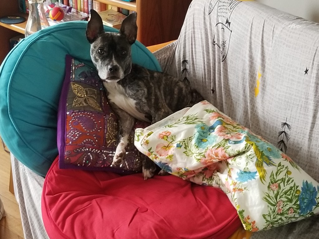 Albie Dog! The sofa is now my office, which causes issues, because to his mind it is really HIS sofa. I needed extra space to set down my computer and stuff so I moved his blanket to the floor and tried to explain to him that he should go to the blanket, and I will get the sofa. And this is the face he gave me.