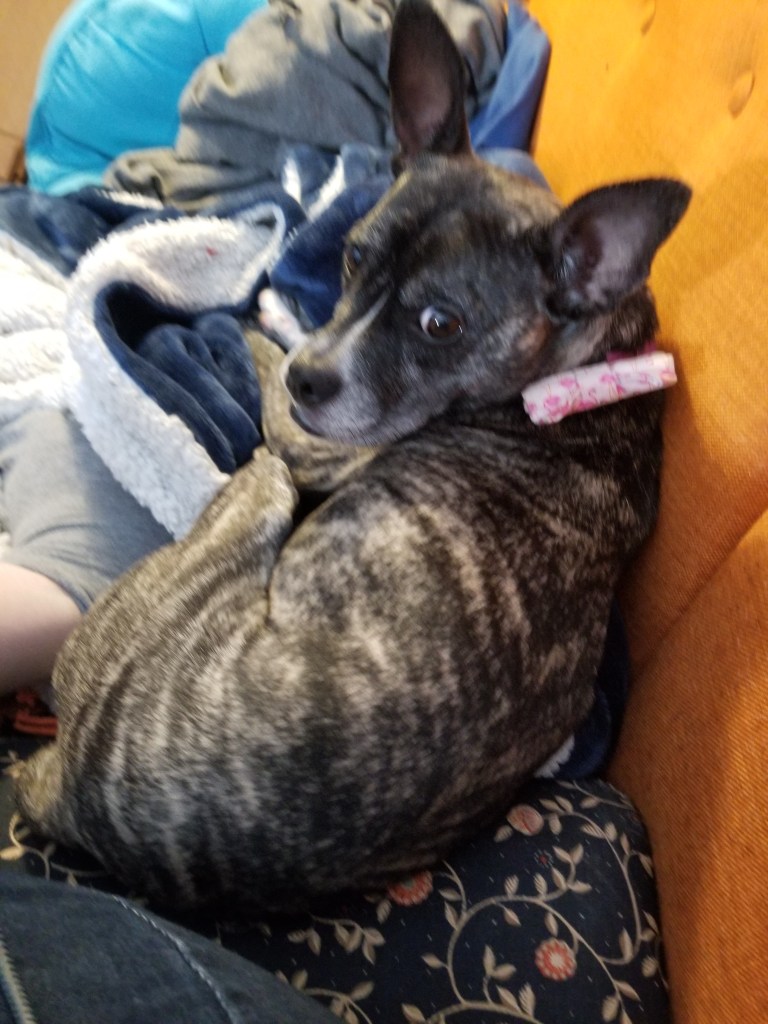 Albie Dog! Yesterday he was cold, so he dug himself all the way into his blanket on the couch and twisted to wrap it around himself. And then he rolled over, with the blanket wrapped around his head, and rolled himself all the way off the couch! He was so surprised.