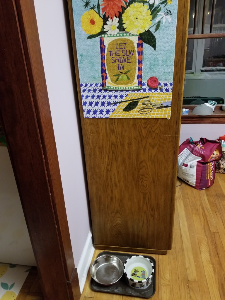 Oh, and I didn’t forget Albie Dog! I found a little corner to tuck his dishes, next to the enormous china cabinet, and I put up a pretty picture for him to look at while he eats. Like at those fancy restaurants that have original art on the wall.