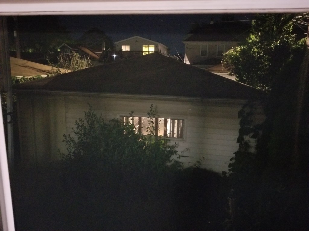 At the end of the apartment is the little sunroom. I can’t get a good picture of the view, the best I can do is this blurry photo of how it looks after dark with the light from our garage and then over the alley at the other buildings.