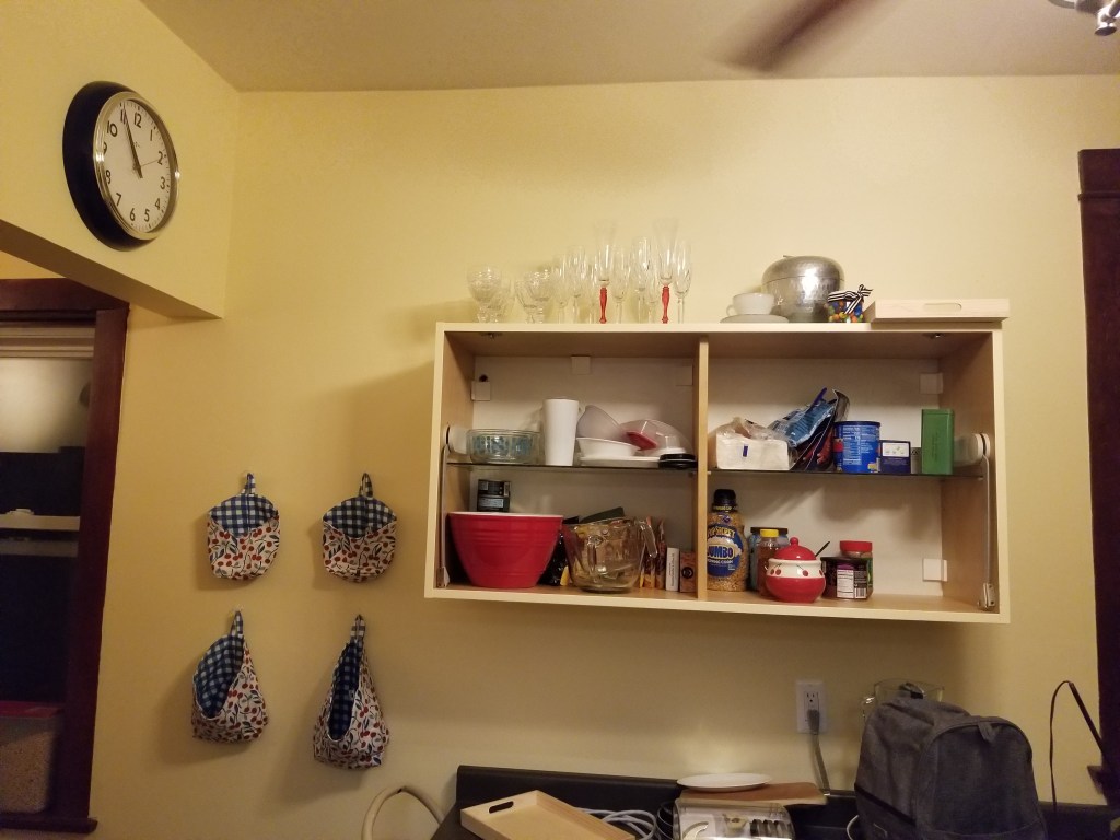 And then next to the dining room, my kitchen! Also mostly a disaster. But I did get a clock hung, and put my fancy champagne glasses on the top top shelf, and I hung the cloth bags I bought from Etsy that I am planning to use for fruits and vegetables. So pretty!