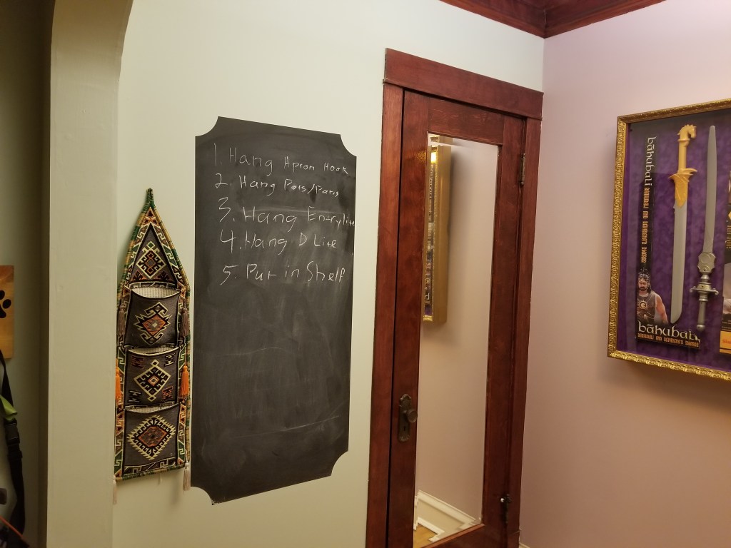 The front hall, mirrored closet door, stick on blackboard, cool wall hanging pockets with chalk and eraser stored in it, and of course the Bahubali swords.