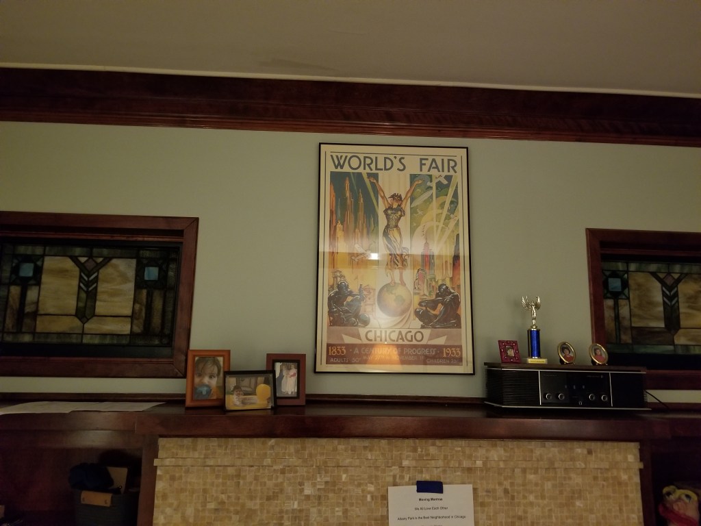 Then, my mantel and stained glass windows, pretty much what sold the building to me and my friends. And above the mantel, the enormous framed poster that used to hang in my office. On the mantel, family photos, and my Dad’s 50 year old radio.
