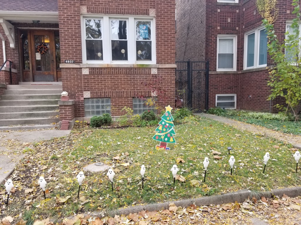 Look at our lovely Halloween/Christmas decorations! Yes, someone has already suggested gluing Santa hats on the ghosties.