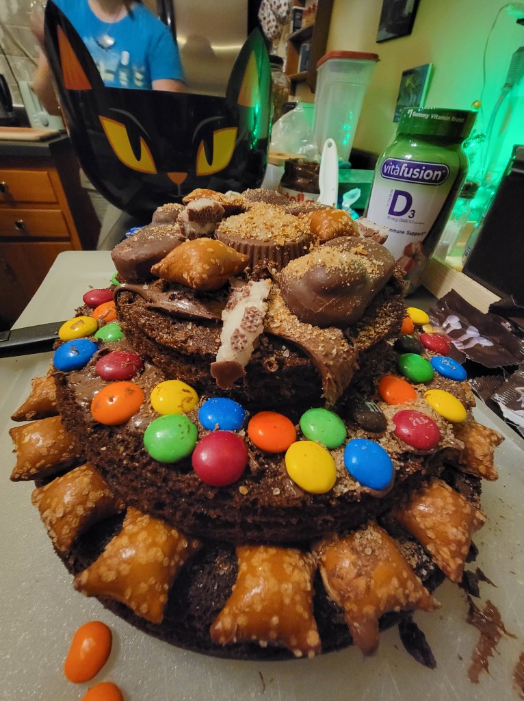 Of course, frosting is my nemisis. So instead of frosting, I used Nutella. Which is goopy and hard and difficult. So I sort of loosely Nuttella’d, mostly in order to hold the layers together. And then my friends helped me use the last of the Halloween candy to decorate, plus some pretzles. I think it turned out kind of fun!