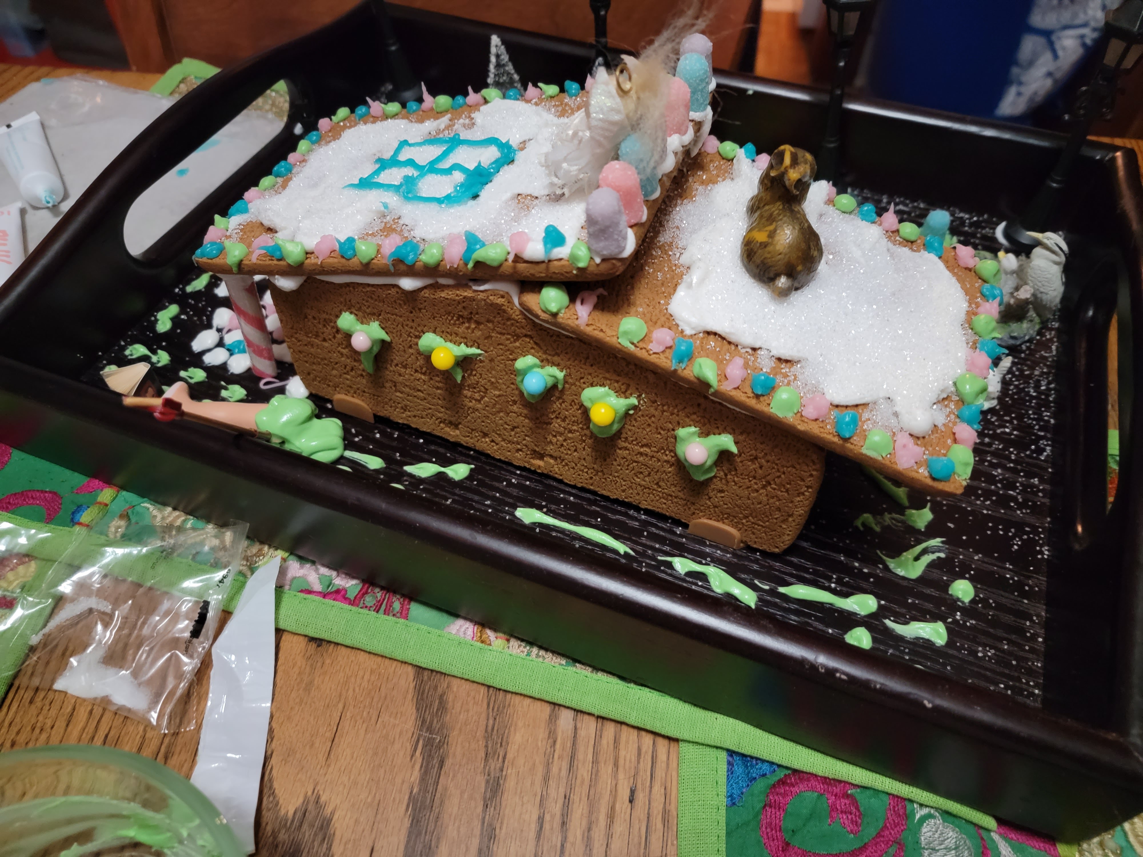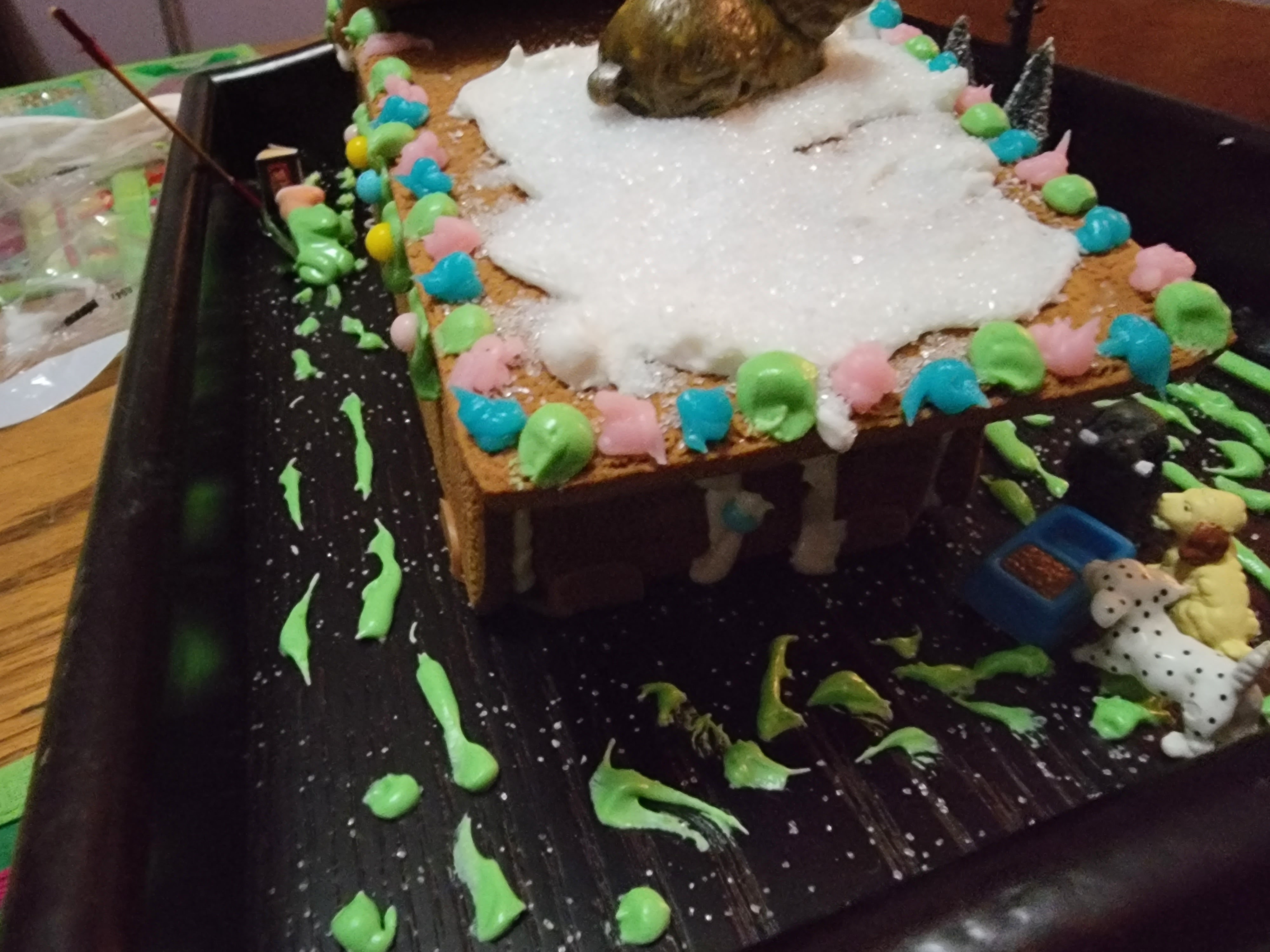 I invited a friend over last night to make a Gingerbread House!!! My sister got me a kit and I knew it might be tricky so I should have another set of hands. And it was tricky, but also fun, and then I raided my dollhouse for additional props.