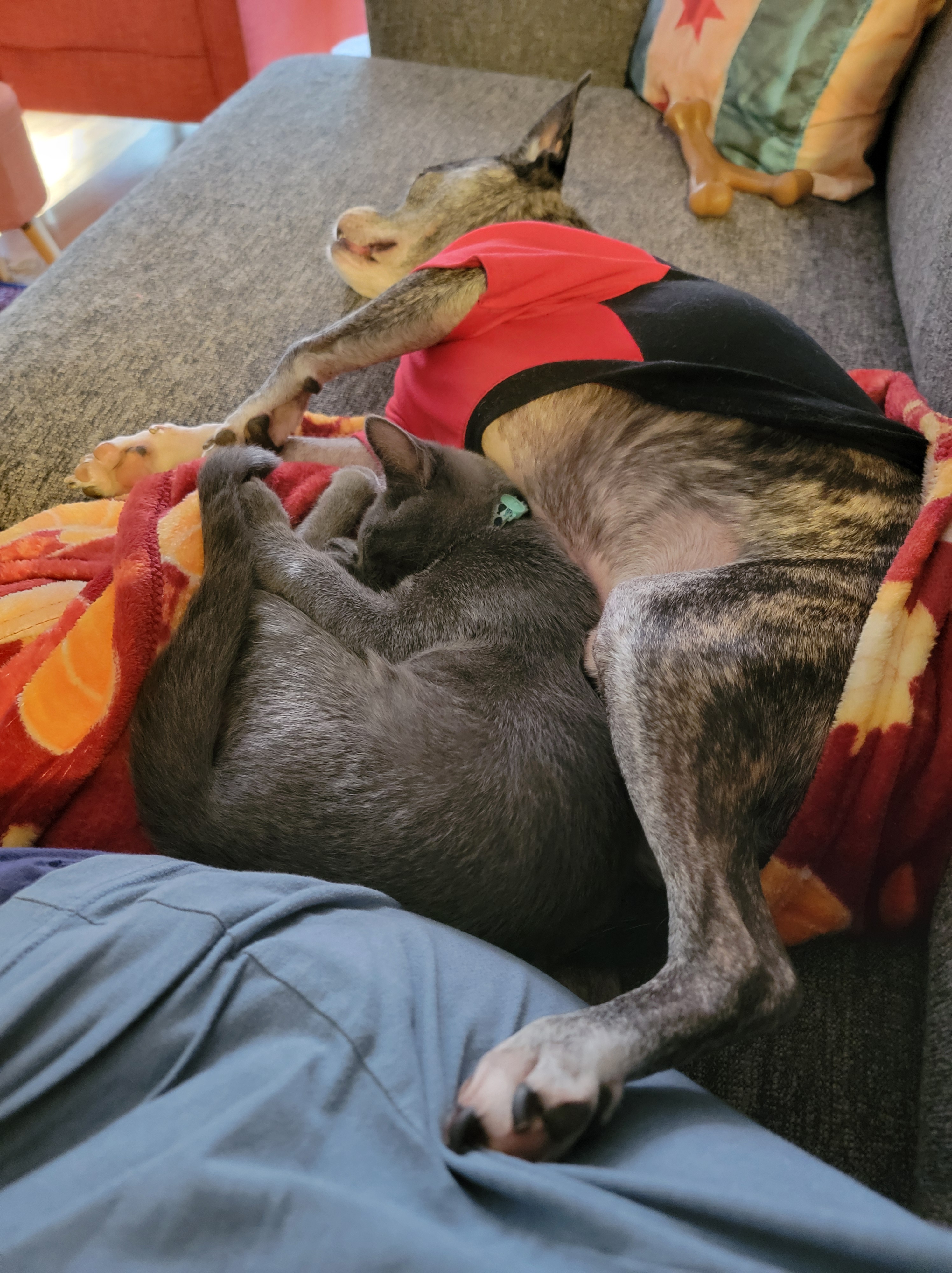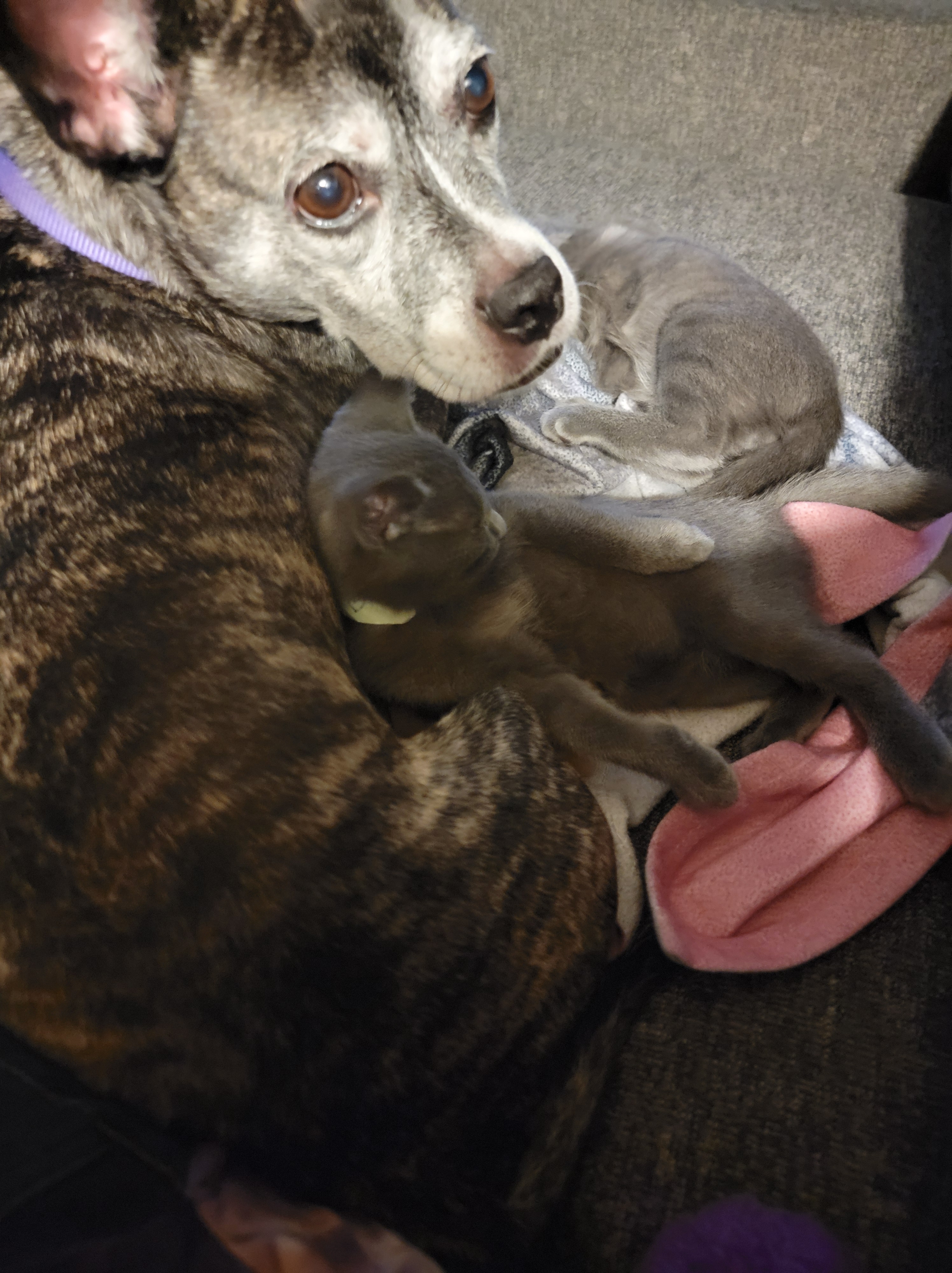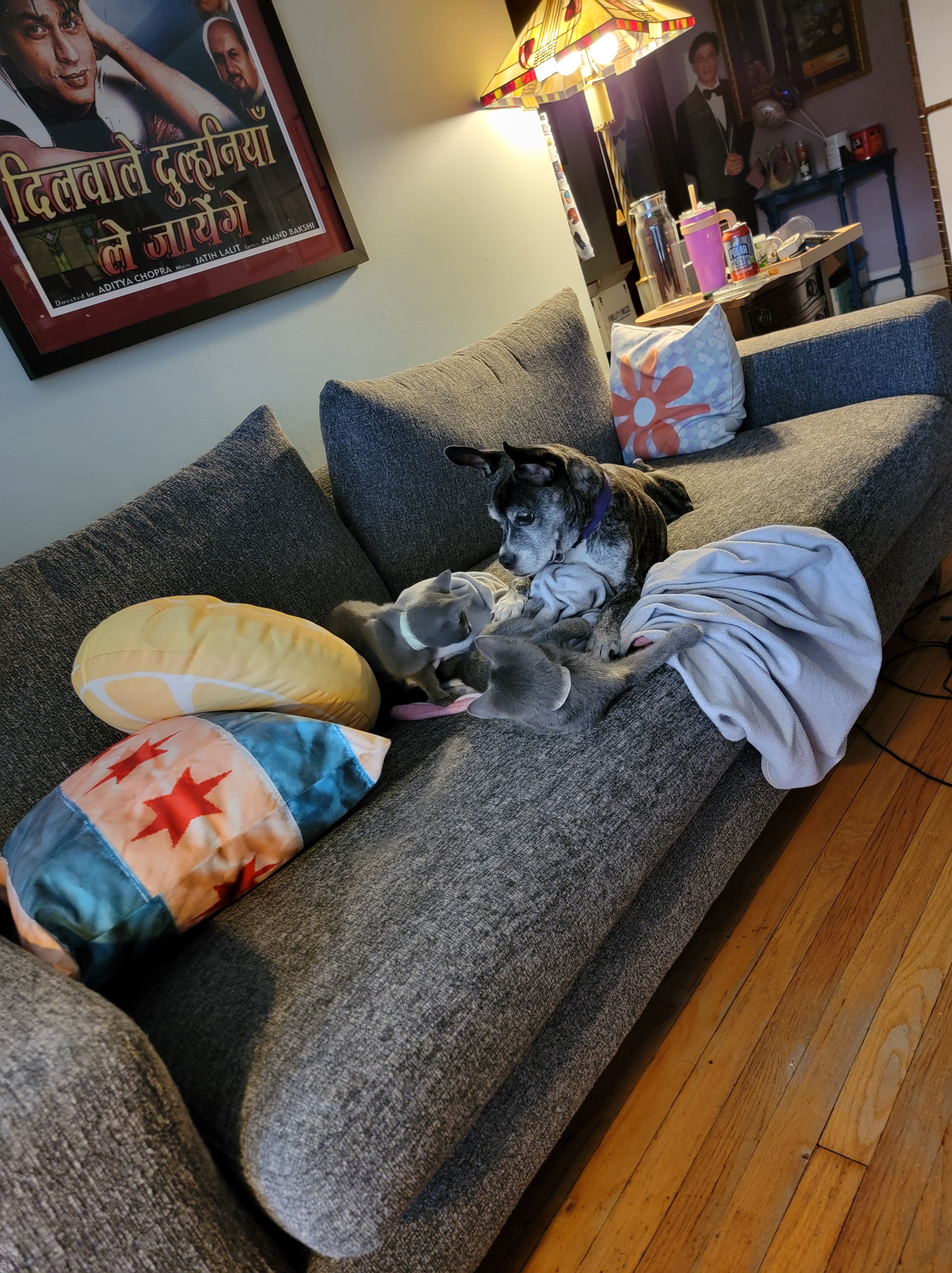 In June, our local alley cat decided to have kittens in our backyard, and about a month after that we managed to get the kittens to a vet and learned they needed eye drops and antibiotics and flea shampoo and all kinds of things that meant they couldn’t go back to Mom in the backyard. So instead, they moved into my sunroom! We started with 5 barely mobile bottle feeding kittens, and as of today I have 3 super healthy and active halfgrown cats. 1 of them is going to his furever home tomorrow morning, so I’ll be down to 2. And hopefully 1 of those will find a home and then I can have just one nice peaceful easy cat. The real problem is that they loooooooooooooove Albie Dog and vice versa, so his emotions have been a rollercoaster all summer.